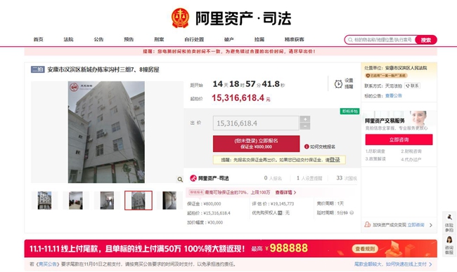 8幢評估價13568762元,7幢評估價5577011元,合計19145773元,起拍價:15316618.4元,保證金:800000元,加價幅度:30000元